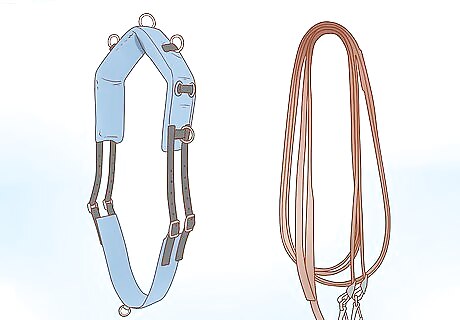 Gather the equipment you need to begin training. Make sure you have an enclosure to work in. A round enclosure works best, so that your horse can practice going in circles on reins or a long lunge line (about 30 feet (9.1 m)). Next, make gather up any basic saddle and long driving reins. A training surcingle is a band that straps around the horse’s chest. It’s not necessary, but they are helpful and inexpensive tools. You can easily clip reins or lines to the many rings on a surcingle. If you don’t have one, your halter is fine to use on it's own. If you don’t have driving reins (which you can buy at a tack store or online), any set of lunge lines will be just fine.