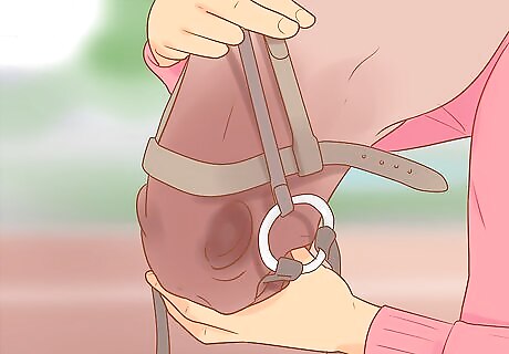 Teach your horse to yield to the bit so that you can control them. In order to effectively direct and control your horse you need them to get used to being on a bit. Place the bit in your horse’s mouth. Then tie the rein connected to the bit to the saddle. Make sure the rein is taut, but not too tight. There should be about an inch of slack. In this position, the horse will move the bit around in their mouth to a position that is comfortable for them. This method is called “tying off”. Your horse will quickly grow used to adjusting the bit themselves.