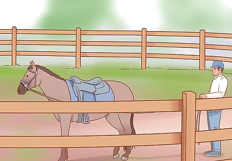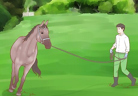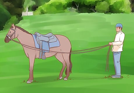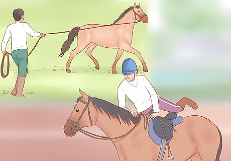 Work your horse on the lunge line to warm them up. Help your horse loosen their muscles by lunging them out. Hook a simple lunge line to the halter or bridle and lead them in a circle around the enclosure. A typical warm-up session should last about 15-20 minutes. During the warm-up, you can practice changing gaits and directions.