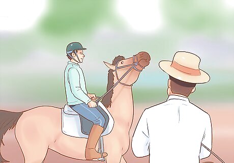 Make sure are comfortable working with horses. It’s important that you are confident in your ability to handle a horse. Horses can sense if you’re unsure, and might not follow your lead. Before training, make sure that you feel comfortable not only riding a horse, but caring for one. If you’re not a skilled rider or handler, that’s okay. Take some riding lessons or ask a local stable if they need some help mucking out stalls. The more you’re around horses, the more confident you will feel. If you have a new horse but don’t feel comfortable training it, you can hire a trainer or ask a friend with more experience to help you.
