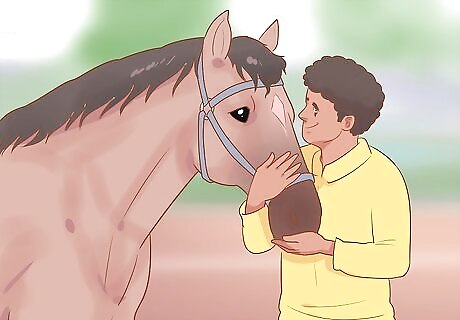 Get to know the horse. Like humans, horses have different temperaments. Before you start training, spend time just being with the horse and observing their nature. You can watch how they react when someone approaches or when you try to touch them. Slowly allow the horse to get used to your touch by softly touching their face. You can speak softly to them so that they get used to your voice. Some horses are more skittish than others and that’s okay. Just know that you might have to spend more time getting them to trust you.