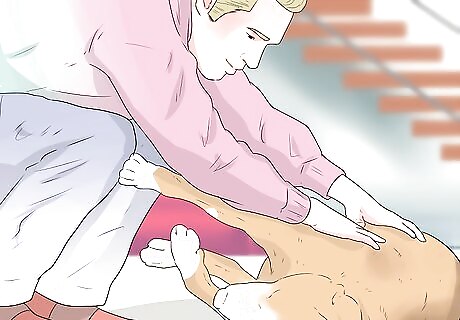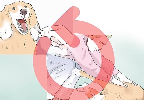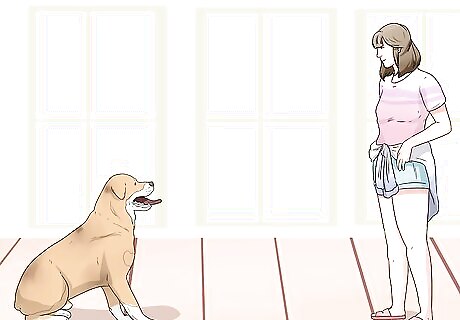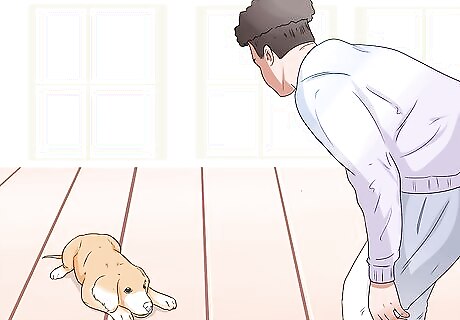 Reward the dog with a highly desirable treat when it behaves. Give your dog the treat as soon as you see the positive behavior. It's helpful to use a clicker to train your dog. That way, you can click the clicker when your dog behaves correctly, then give it a treat. This gives you a little bit of time to get the treat ready, while still reinforcing the good behavior you want to see from your dog. Timing is very important when it comes to training your dog. It's important to click the clicker or give your dog its treat immediately after the good behavior. Make sure the treat is something your dog loves. The most common reward is a treat. Try boiled chicken, string cheese, or chicken hot dogs. You could try a bone or dog treat. You want to reward the dog when it responds to your command and behaves. If the dog ignores or rejects your command, no treat. If treats are the preferred item, keep them handy so that you can practice throughout the day, such as anytime you get up for a drink/snack or bathroom break. You could toss the treat on the ground so the dog has to get up. Then, wait again until the dog chooses to sit, without any encouragement from you. When the dog does, say, "Yes!" in a happy tone, and deliver a super yummy treat. Repeat this 5 or 6 times.