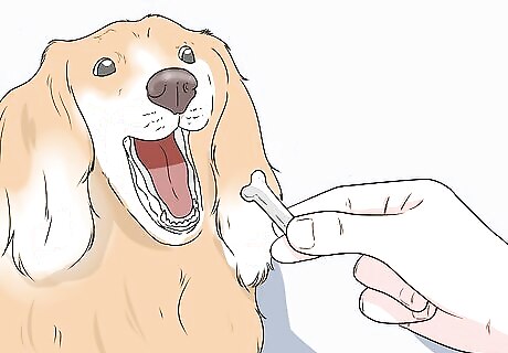 Try using other positive reinforcements instead of treats. Sometimes a dog is not food driven, so consider whether they are into a ball or a tug toy. Other dogs just love attention. You have to figure out what makes your dog happiest, and then use that as their reward. Praise is simply a happy, excited voice and gentle touching. This is the cheapest and easiest reward to offer. You could also use a favorite toy as a reward. Touch is another great way to reward a dog. Some dogs respond to being petted or their tummies being rubbed. A brisk 10-minute walk can also be a reward if you are able.
