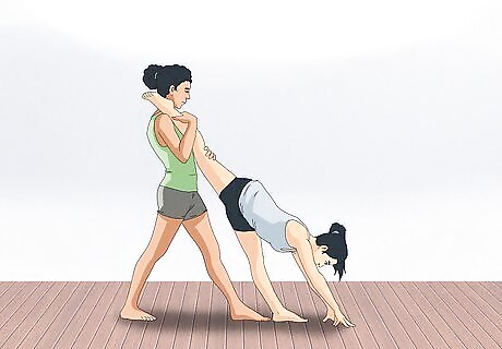 Ask a friend or workout buddy to help you with assisted stretches. Assisted stretches involve a second person holding or lightly pushing on your shoulders, limbs, or other areas to help you get a deeper stretch. Choose someone you trust and communicate exactly how you want them to push you. Tell them to stop if you feel any pain or you go beyond your limits. For example, a friend could push your knees down during a butterfly stretch or pull on your leg during a hamstring stretch. Try starting a competition with your flexibility friend to see who can get into the splits first. A little challenge makes great motivation!