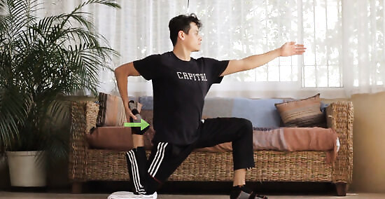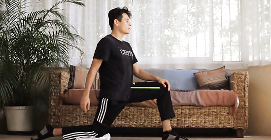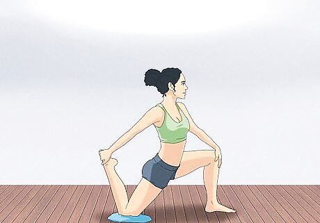 Practice lunge stretches to loosen your hips. Start with your left knee on the ground (preferably on a cushion or towel) and step forward with your right foot. Bend both knees until your right thigh is parallel to the floor and your left shin is touching the ground. Put your hands on your hips, keep your back straight, and lunge forward to stretch your hip and upper thigh. Hold the stretch for 30-60 seconds, then repeat on your other leg.