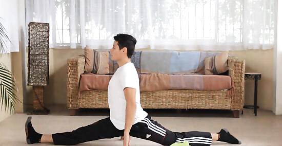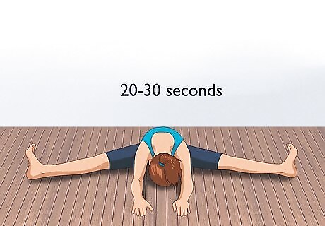 Start with a seated straddle stretch, also known as a V-stretch. Sit on the floor and spread your legs into a wide “V” shape, then lean to the right and reach as far as you can down your leg, trying to touch your toes. Keep your back as straight as possible and hold the position for 30-60 seconds. Repeat on your left leg. Place your feet against a wall if it helps you spread them wider and get a deeper stretch. After stretching to both sides, extend your arms straight in front of you and bend forward. Try to touch your chest to the floor and hold for 30-60 seconds. Straddle stretches work your hamstrings, inner thighs, lower back, and calves. They’re great for gymnasts, dancers, and anyone who wants to do a split.