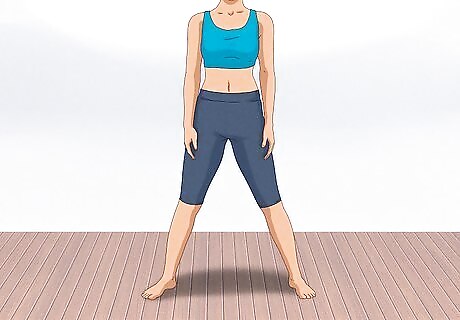 Begin middle splits in a standing position. Stand tall with your feet wider apart than your shoulders and your toes pointing forward. Take a few deep breaths to relax and loosen up your muscles. Make sure you’re wearing socks to help your feet slide over the floor more easily.
