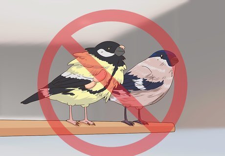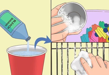 Clean all birdcage surfaces regularly. Finches can catch avian flu from a contaminated surface, as the virus can live outside of the body of finches for some time. Clean any communal, shared surfaces inside of your finch’s cage by disinfecting them with a 10% bleach solution. Objects to clean include the birdbath (or shallow dish for the birds to bathe in), feeding dishes, and any toys or perches that the birds use. If you own a pet store or run an aviary, birds can easily catch pox from a communal birdbath or in a shared cage.How to Disinfect a BirdcageRemove the bird from the cage and transfer it to a safe location.Put on disposable gloves and remove all of the toys, dishes, bird feeders, stands, accessories, and other objects from the cage. Dispose of any leftover food as well as the cage liner and droppings.Mix together 9 parts water and 1 part bleach in a bucket or basin. Dip a rag in the solution and use it to wipe down all the toys, dishes, and accessories as well as the entire birdcage.After 5 minutes, thoroughly rinse the cage and all of the objects with hot water.Let all of the items air dry in the sun. Then, put a new liner in the bottom of the cage and replace all of the dishes, toys, and accessories.Transfer your bird back to the cage.Dispose of the remaining bleach solution, the rag, and the gloves.Repeat the entire process each week to help prevent the spread of avian pox.