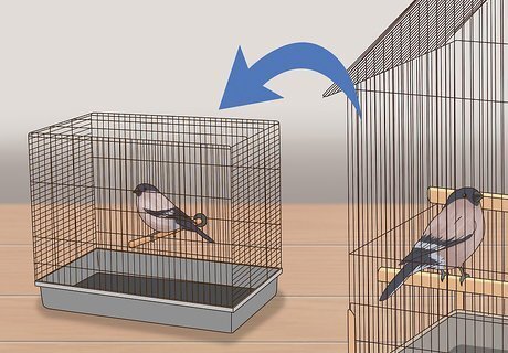 Quarantine your sick finch. As soon as you suspect that one of your finches may be sick with the avian pox, it needs to be removed from all other finches (and other pet birds) immediately. Place the sick bird in a separate cage, in a separate room of your house or apartment. Once the finch is quarantined, use separate equipment to handle, feed, and water the finch. The avian pox virus is highly communicable, and a single infected finch can unknowingly pass the disease on to an entire cage of birds. Be sure to disinfect the bird’s cage and any surfaces or food bowls it may have come in contact with.