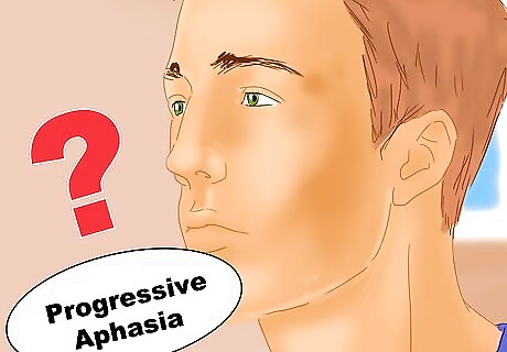 Consider asking for a head CT or MRI. In addition to ruling out other degenerative brain diseases, it is also key to differentiate progressive aphasia from other causes of aphasia (communication troubles), such as aphasia resulting from a stroke or a traumatic brain injury. Your doctor will be able to rule out other conditions such as a stroke or a traumatic brain injury by performing a neurological exam, as well as by offering you a head CT or MRI which can give further insight into any anatomical or structural problems. Progressive aphasia will show shrinkage of certain brain tissues (related to the language functions) on CT scan. However, the appearance of progressive aphasia can be differentiated on imaging from a stroke or a traumatic brain injury.