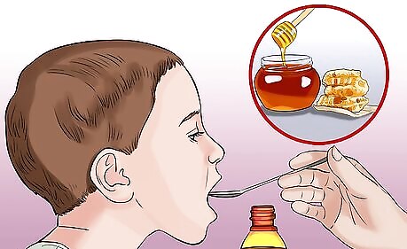 Give your child honey. If your toddler is over one year old, honey is a great remedy for cough and sore throat. A spoonful before bed or throughout the day will be a treat and will ease coughing and throat pain. You can also dissolve 1-2 teaspoons of honey in hot water or tea (but be sure to let it cool down before giving it to your child). Honey should not be given to children under one year of age. If your child shows any signs of allergic reaction, such as swelling, hives, or lethargy, you’re your pediatrician. If more serious symptoms occur, such as difficulty breathing, call 911.
