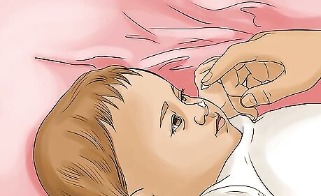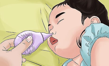 Clean your child’s nose with saline and a bulb syringe. Young children usually do not know how to blow their nose, so you need to clean their nose for them. The saline moistens the inside of the nose and breaks up mucus a little, so that you can suction the mucus out with the bulb syringe. Tilt your child’s head back a little and use an eyedropper to squirt 1-2 drops of saline into each nostril. Squeeze the bulb, pushing the air out, and gently put the tip of the syringe into one nostril. Release the squeeze on the bulb, and mucus from the nose should get sucked into the syringe. Do this before bed and up to four times daily. Make sure the syringe is clean before putting it in your child’s nose.