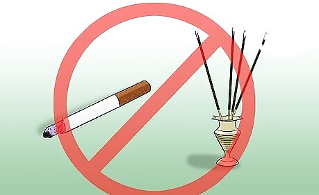 Keep irritants away from your child. While your child is sick, anything irritating to the nose, throat or lungs can make their cough worse. Avoid strong scents in the home like incense or air fresheners, keep pollen outside where it belongs, and do not smoke around your child. Exposure to smoke can cause asthma in children and can keep them sick for longer. Even exposure to second-hand smoke from your clothes or hair can worsen your child’s cough or breathing problems. If you do smoke, do so outside away from your child, change clothes when you come inside (or have a big overcoat you wear specifically for smoking to protect your clothes) and tie back or cover long hair to prevent it bringing smoke into the home.