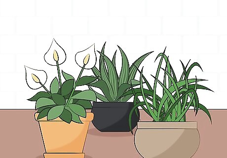 Put the plants in small, well-draining pots filled with nutrient-dense potting soil. Either purchase, plant, or propagate the plants you want to put on your bookshelf. Go to your local garden supply store or nursery to buy starter plants if you'd rather not go through the hassle of germinating seeds and waiting for them to sprout. Buying plants can be pricey, so look for special sales and buy smaller ones to save a few bucks. Most flowers and houseplants can be put in potting soil, but things like succulents and air plants need different types of soil (or none at all) to ensure the roots don't get too moist. If you're sowing the plant from a seed, fill 4 in (10 cm) containers with potting soil and stick the seed ⁄4–⁄2 inch (0.64–1.27 cm) into the soil (or however deep the seed packet specifies). Water them every day until you see sprouts. Once they're 4 inches (10 cm) tall, you can transfer them into larger pots. If you already have some plants you like, consider propagating them if possible. Pothos, prayer plants, African violets, gardenia, umbrella plants, rosemary, and philodendron are all super easy to propagate from cuttings.Tip: Always use pots with a well-functioning drainage hole at the bottom to ensure the soil doesn’t get too moist.