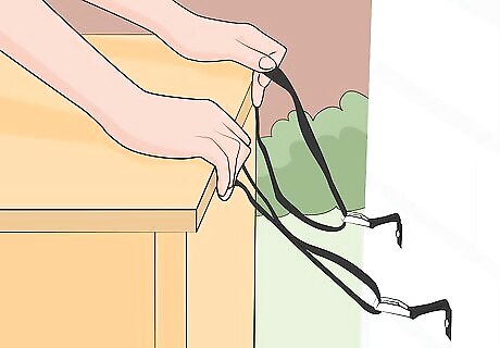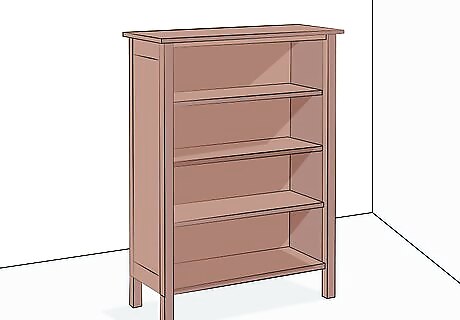 Install furniture anchoring hooks on either side of the shelf to hold it in place. Once your bookshelf is in place in front of a wall or fence, screw or nail furniture anchoring hooks or brackets into the wall behind the bookshelf on the left and right sides. Attach the other end of the anchoring hooks (at the end of each strap) to the back of the bookshelf either with nails or screws. The strap between the shelf and the wall should have very little slack so the bookshelf won’t wobble or topple over. There are different types of furniture anchoring kits so choose one that works for the material of your walls and the shelf (e.g., heavy-duty screws work best for cement board walls while nails will work for wood and drywall). You can buy them at any hardware or home improvement store. This is especially important if you live in an area with earthquakes or strong winds that might blow it over. If you're using a leaning bookshelf, definitely secure it to a wall! If you're keeping it inside or only putting a few small plants on it, it's okay to skip this step.