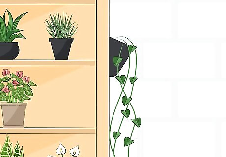 Arrange the potted plants on the shelves with the heaviest at the bottom. Put the heaviest containers on the bottom shelf and the lightest ones on the top to help the bookcase stay level and sturdy. Be sure to leave some space between the plants so they're not too cramped and having to fight for sunlight. For example, say you have a large potted fern, a big rubber plant, a few medium-sized flowering plants, and some small herbs or cacti. Put the fern and the rubber plant on the bottom, the flowering ones on the middle shelves, and the small pots on top. However, if you have a flowering plant that needs more sunlight than the cacti (like a shasta daisy versus Thanksgiving or Easter cactus), swap them so each plant gets the light it needs. If you have trailing plants, put those on top so the leaves can hang down the sides and front of the bookcase. If a bottom shelf doesn't get as much light because of the way the bookshelf is facing, it's okay to put that plant on a higher shelf if it needs more light. Just make sure the bookcase is secured to a wall or fence so it doesn't topple over.