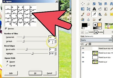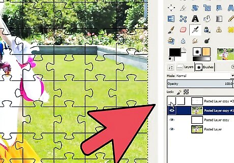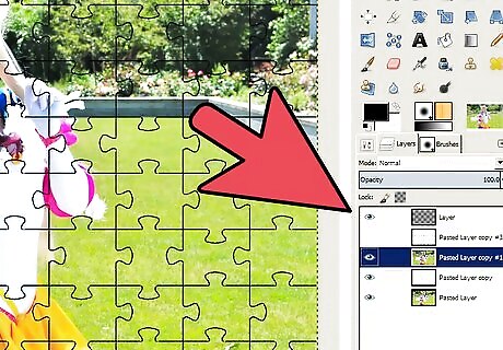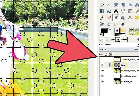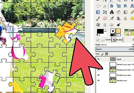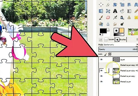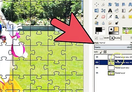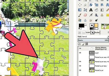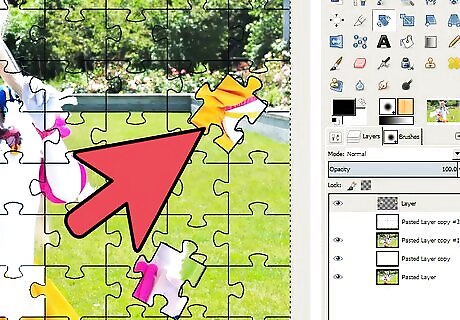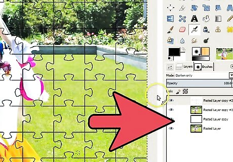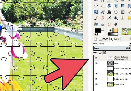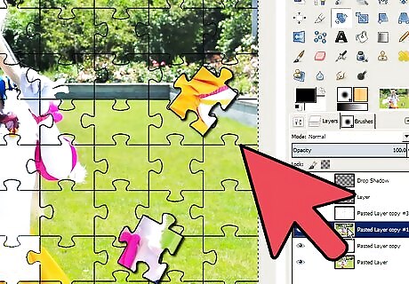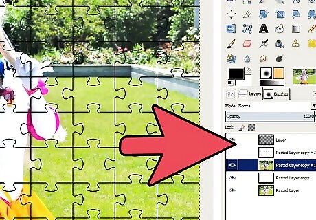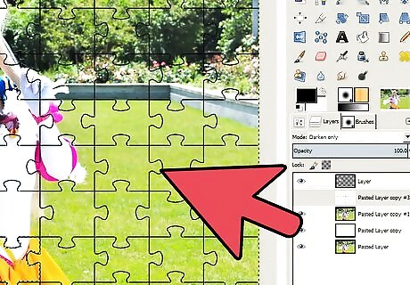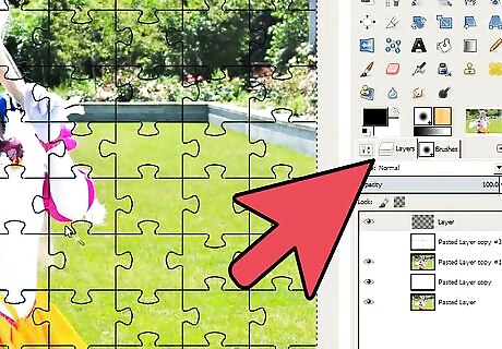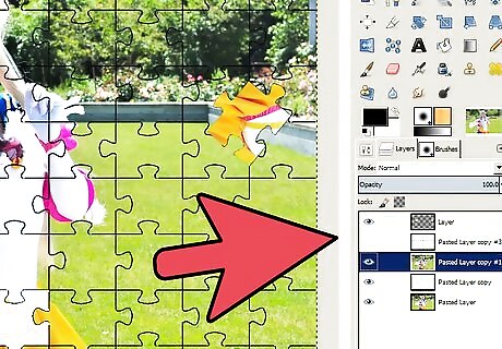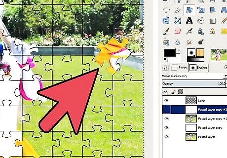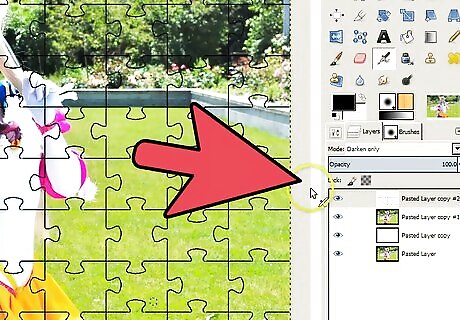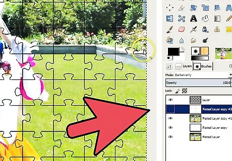 Open your photo in GIMP and add the jigsaw from the previous step as a new layer (use File - Open as Layer).