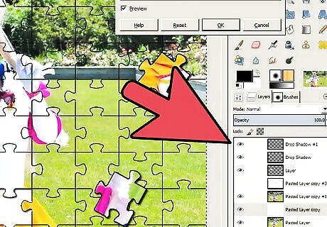 Select one piece layer and add a Drop Shadow (Script-Fu - Shadow - Drop Shadow). To make a future step (shuffle) easier, 'two layers have been merged.