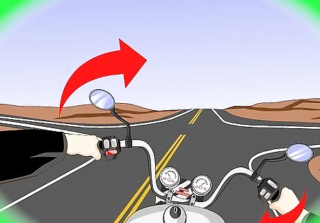 Countersteer gently to make the turn. Initiate the turn by gently loosening your grip on the left handle of the handlebars, and pressing on the right side of the handlebar, tilting it gently left, and leaning into the turn. Turning is mostly about leaning gently, not about turning the handlebars. You neither need to lean nor turn very much to negotiate the turn properly.Turn Right on a Motorcycle Step 6Bullet1.jpg Make sure, if you have a passenger, that the passenger knows to lean into the turn, not out of it.