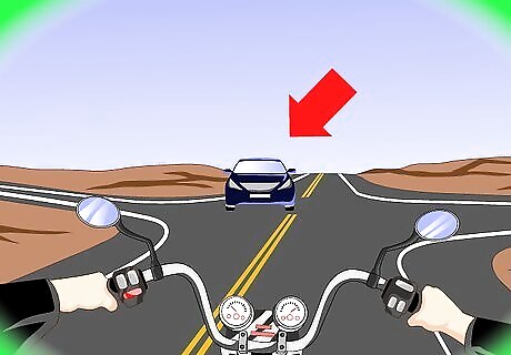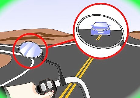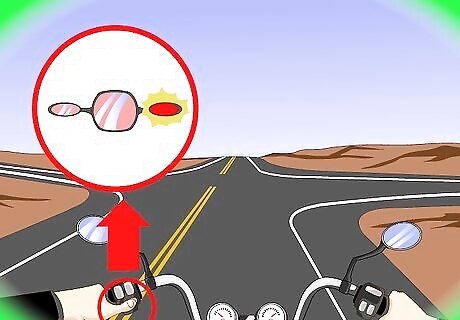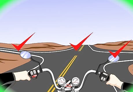 Check for on-coming traffic and yield, if necessary. Make sure you look to the left for traffic coming through the intersection and straight ahead for traffic turning left. In the United States, turning right on a motorcycle means you need to look for drivers turning left in front of you, pedestrians who may be crossing the street onto which you're turning, and possible bicycle traffic to your right. In the UK and elsewhere in the world, turning right on a motorcycle means you need to yield to oncoming traffic and wait for an opening or an appropriate turning signal before negotiating the turn. You'll sometimes have to come to a full stop in the turning lane.