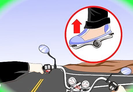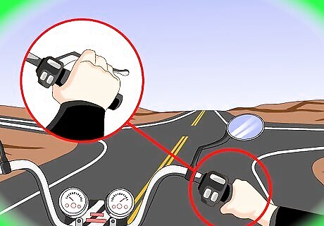 Slow your speed and downshift. Depress the clutch and brake if necessary to slow the motorcycle to the appropriate speed for making the turn. Shift into a lower gear before you make the turn, to keep the bike at a consistent speed. Gently release or "feather" the clutch as you steadily increase the throttle. This assures that you don't put too much power to the tires and cause them to slide out. Generally, for city driving conditions, second or third gear is appropriate for negotiating a turn at a moderate speed, though some bikes with V-twin engines, like Harley-Davidsons, will be more comfortable to turn at first gear. The higher low-end torque of these engines make back-wheel skid more likely.Turn Right on a Motorcycle Step 5Bullet1.jpg All your speed adjustments and braking should be done prior to the turning motion, not during. Each turn will require a different degree of speed to make the turn safely, so much of this will have to do with your judgment and your feel of the bike and of the turn.Turn Right on a Motorcycle Step 5Bullet2.jpg
