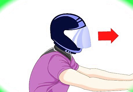 Keep your head up. It's very important to look up, at where you want the motorcycle to go, not down at the front wheel, or directly in front of you. If you look straight at the object you wish to avoid you will likely hit it. Never put your leg down to assist a turn. It's very easy to lose control of the bike and injure yourself this way.Turn Right on a Motorcycle Step 7Bullet1.jpg