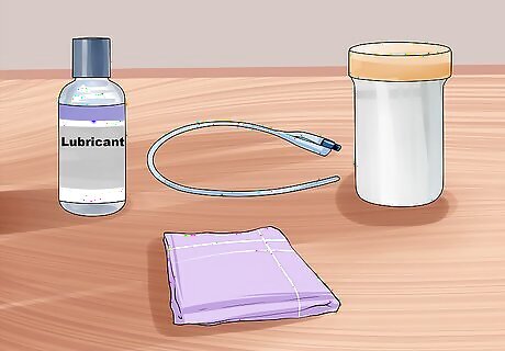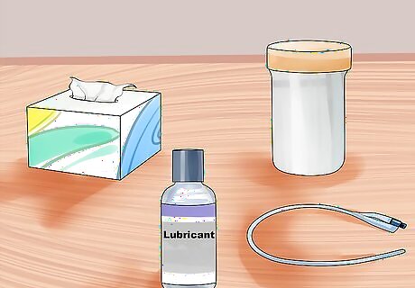 Gather the supplies. Before you start, you need to make sure you have all your supplies together. You need your catheter, open and ready to be used, a cleaning wipe, lubricant, and a container for the urine, if needed. After opening the catheter, make sure to only touch the end of the catheter that will be outside your body.