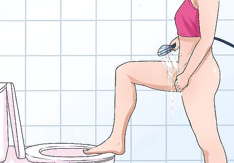 Wash the genital area. Place one leg on the toilet and twist just a bit to one side. Using one hand, spread the labia and locate the urethral opening. Using your other hand, wash the entire genital area three times, going from front to back to avoid introducing bacteria from feces into the genital area. Rinse well and dry with a cotton towel. Use a fresh towelette or baby wipe every time you wipe. Alternatively, you can use cotton balls with mild soap and water. You can use a mirror to help you see what you're doing.