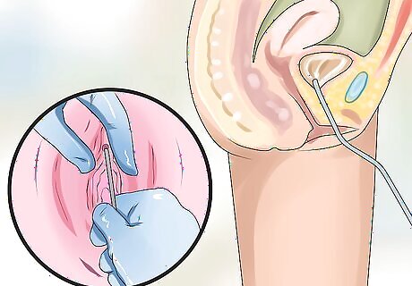 Insert the catheter. Apply a small amount of the lubricant to the tip and the first 2 inches of the catheter. Take a deep breath, and with one hand separating the labia, use the other hand to insert the catheter gently into the urethra using firm, gentle pressure. Don't push hard, and don't force it. As you insert it, exhale slowly. Twist the catheter slightly one way and the other to help it through the urethra. Insertion can be quite uncomfortable, so breathing can help make it more comfortable. If the catheter is not sliding in, don't worry. Try to relax, breathe deeply, and try again. If the catheter comes pre-lubricated, you don't have to apply more lubricant. The tubing cannot be pushed through the bladder, so don't worry about that.