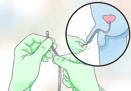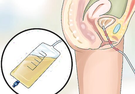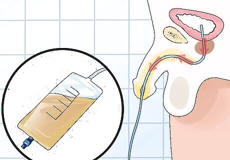 Make sure the external end is secure. Once the catheter enters the bladder, the release of urine will be immediate. Be prepared for this by either having the external end in the toilet or a drainage bag. Keep the drainage bag as low as possible, allowing gravity to do its part. When the urine begins to flow, push the catheter in about two more inches.