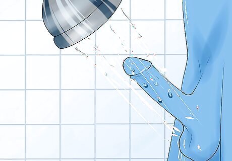 Wash your penis. Wash the tip of your penis with a towelette, soap and water, or baby wipes. Don't use alcohol to clean off the tip of your penis. Alcohol can be very drying. Push back the foreskin of your penis before you wash if you are uncircumcised. Make sure to keep the foreskin back during the whole catheterization process.