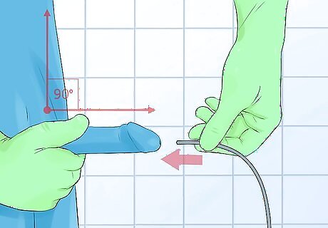 Insert the catheter. Hold your penis straight out from your body, stretching it so that it is at a 90 degree angle (right angle) to your body. Take a deep breath, and using your other hand, insert the catheter using firm, gentle pressure. Exhale as you insert it. Do not push hard on the catheter, and do not force it. Twist the catheter slightly one way and the other to “thread it” through the urethra. The male urethra is quite long; you will not push it too far, though it may look as if a very long part of the catheter has disappeared into you. Don't worry, you won't be able to push it through your bladder. Insertion isn't usually painful, but it can be quite uncomfortable. Breathing can help. If the catheter is not sliding in, try to relax, breathe deeply, and try again. Use a mirror placed so that you can see what you are doing, especially the first few times. Some men prefer to gently squeeze the end of the penis to open up the urethra just as they begin to insert the catheter Pulling the penis straight out straightens out the urethra and allows the catheter to follow the straightest path to the bladder.