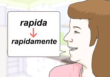Add the suffix -mente to adjectives. You probably know that to form an adverb in English, you simply add -ly to the root of the adjective. The Spanish language works the same way, except you use -mente, and you tack it onto the end of the singular, feminine form of the adjective. For example, the feminine form of the adjective that means "fast" in Spanish is rápida. So if you wanted to say that someone was running quickly, you could use the adverb rápidamente. Note that you always use the feminine form of the adjective, even if you are talking about a man or a masculine noun. You don't subtract any letters from the adjective to form the adverb, as you sometimes do when forming adverbs in English.