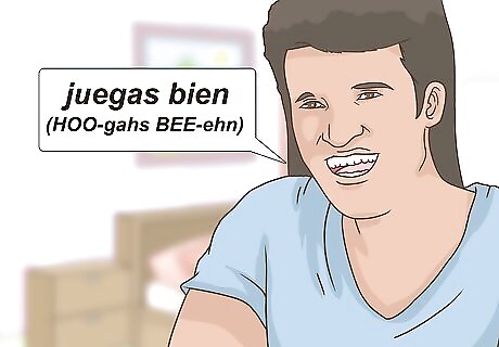 Learn the correct placement for adverbs. Generally, Spanish adverbs go immediately after the verb they modify. If they are modifying an adjective or other adverb, however, they go before the word they modify. For example, if you wanted to say "you play well," to a Spanish-speaking teammate, you would say juegas bien (HOO-eh-gahs BEE-EHN). Note that the adverb follows the verb in that sentence, just as it does in English. However, unlike English, you can't put an adverb between two verbs. In Spanish, the adverb must follow the last verb, as in "vamos a jugar aquí" (VAH-mos ah HOO-gahr ah-KEE), which means "let's play here."