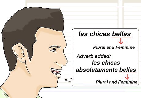Distinguish between adjectives and adverbs. Spanish adjectives can be more complicated to use than adverbs. Adjectives must agree with the gender of the noun they describe, and can be either singular or plural. Adverbs always stay the same, regardless of whether they modify an adjective or a verb. For example, if you were talking about "beautiful girls" in Spanish, you would say las chicas bellas (lahs CHEE-kas BELL-ahs). Note that the adjective, bellas, is both plural and feminine. However, if you added an adverb, it wouldn't change at all. "Absolutely beautiful girls" would be las chicas absolutamente bellas.