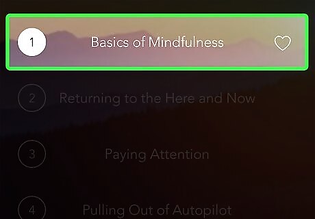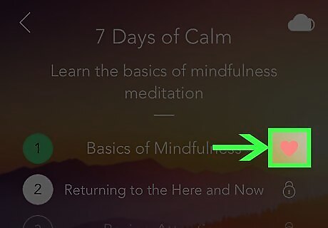 Save a meditation to your favorites. If you decide you like a certain meditation and want to add it to your favorites, tap the heart icon at the bottom of the screen while it’s playing. Your favorite meditations are added to the ″My (heart)″ tab at the top top of the ″Meditate″ screen.