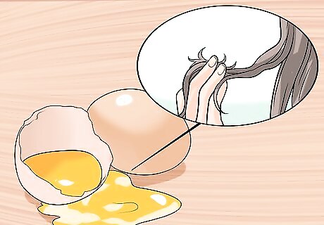 Make or obtain egg oil. You can make your own egg oil simply by heating egg yolks on the stove in a saucepan until they elicit a dark colored oil. Make sure to cool the oil before applying to your scalp, as you don't want to burn yourself. You can also mix the egg oil with ingredients like two tablespoons olive oil to make create more of a mask and easier to apply. Another option would be to a tablespoon or so of honey, both for its nice scent for also for the shine and vitality it will add to your hair. You can purchase egg oil commercially. Just make sure that you are buying 100% egg oil and not something combined with artificial solutions or chemicals.