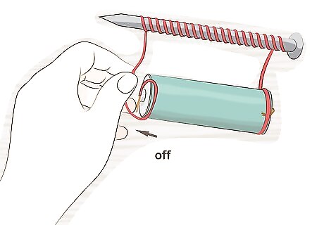 Wrap the ends of the wire around the contacts of an AA battery. Take one end of the wire and wrap it around the positive or + contact of the battery. Take the other end of the wire and wrap it around the negative or - contact on the battery. When the wire touches both sides of the battery, it will complete the magnet circuit. If you can’t wrap the wire around the negative end, you can hold the wire against the contact and the electromagnet will work.