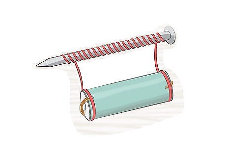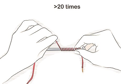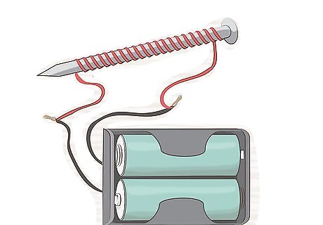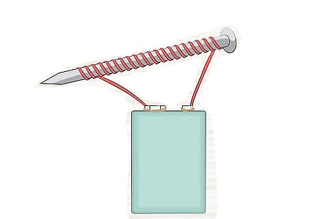 Wrap the magnetic wire around an iron nail at least 20 times. Get a nail that is at least 3 inches (7.6 cm) long. Tightly wrap the wire as you coil it around the nail. Continue wrapping the wire until you don't have any more wire left and there is at least 3 inches (7.6 cm) of excess wire hanging down from both ends of the nail. Using an iron nail will greatly increase the strength of the electromagnet.