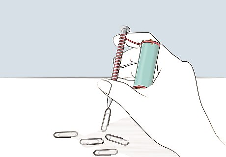 Use the electromagnet to pick up magnetic metals. Hold the electromagnet up against metal alloys like alnico or items that contain magnetic metals to pick them up or attract them to the electromagnet. Magnetic metals include iron, nickel, and cobalt. Try it on lighter items like nails or paperclips. Electromagnets will also attract certain items that contain magnetic metals such as ink and certain kinds of cereal. Stronger electromagnets will be able to pick up larger magnetic items.