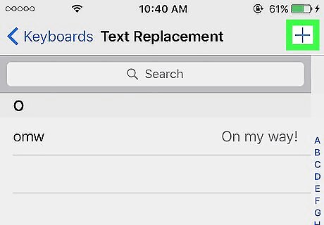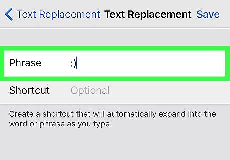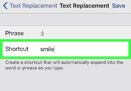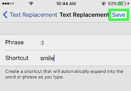 Tap Save. It’s at the top right corner of the screen. Your shortcuts are listed in alphabetical order. To edit a shortcut, tap it, make your changes, then tap Save. To delete a shortcut, tap Edit at the bottom left corner of the list, then tap the red minus (-) sign next to the unwanted shortcut.