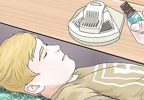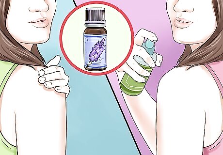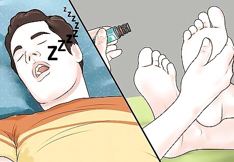 Treat insomnia with lavender, roman chamomile, and clary sage essential oils. Using essential oils will not cure insomnia or its root cause, but using calming and relaxing essential oils before bedtime can help you to fall asleep faster and stay asleep until your intended wake up time. Three of the best essential oils to help with insomnia are lavender - to promote relaxation, Roman chamomile - which is a natural sedative, and clary sage - which contains narcotic properties. If you have a vaporizer, add a few drops of lavender, Roman chamomile, or clary sage oil to it before you get into bed. Try adding a couple of drops of oil to your bedtime bath, or try massaging a large area dilution into your legs and feet before bed. Keep in mind that some essential oils, such as rosemary, cypress, grapefruit, lemon and peppermint, can be particularly energizing and stimulating, so they are best avoided before bedtime.