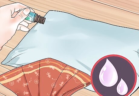 Sprinkle essential oil on cushions and pillows. Sprinkle two drops of essential oil onto the cushions in your living space and your pillows. You will enjoy the aroma of the essential oils every time you sit or lay your head down. If you are worried about damaging the fabric, put the essential oil drops on cotton balls and place them inside the covers of your cushions and pillowcases.