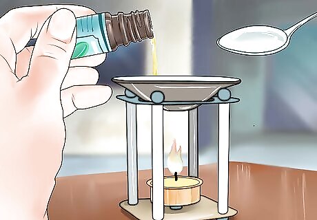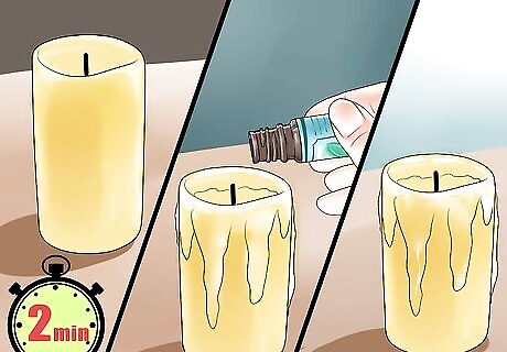 Pour some essential oil into candle wax. Light a candle and wait a minute or two to allow a small amount of wax to melt. Blow out the candle and add a couple of drops of essential oil to the melted wax, before carefully relighting the candle. Take care not to drop any oil on the wick as essential oils are highly flammable.