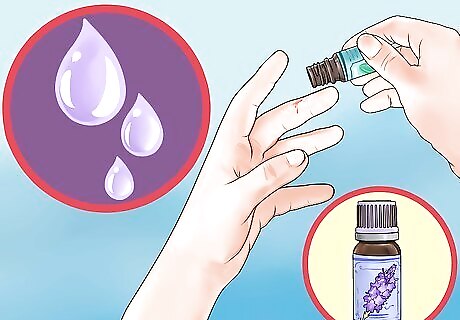 Treat minor wounds with essential oils. Lavender, tea tree oil, eucalyptus, peppermint, tea tree, and several other essential oils can be used to treat minor wounds like cuts, burns or bug bites, thanks to their antibiotic properties. To use essential oils for a minor wound care, clean the wound first. Make sure that the wound is not bleeding. Then, apply a small amount of a 2-3% dilution of essential oil (2-3 drops per teaspoon of carrier oil). Apply the oil topically 2-5 times a day until the wound has healed. After application, you can also apply a cold compress to the wound to ease bleeding and swelling and to seal in the oils.