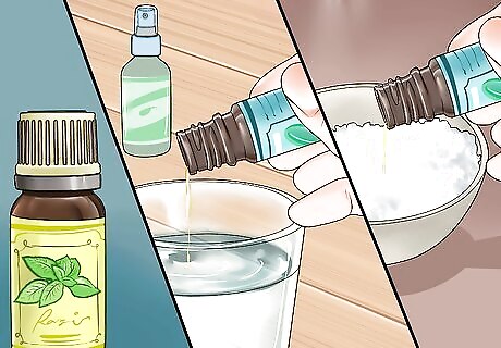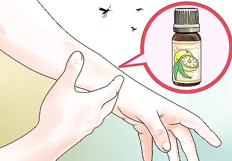 Repel insects with lemon eucalyptus essential oil. Many store-bought insect repellents are full of harsh synthetic chemicals, which smell unpleasant and may irritate your skin. A strong dilution of lemon eucalyptus oil is an excellent (and great smelling) alternative to help keep the bugs at bay. You can mix the oil with a base oil and apply it directly to skin, or you can place the oil in a diffuser or burner near an open window. To make your own insect repellent, combine 2 tablespoons (29.6 ml) of carrier oil, 2 tablespoons (29.6 ml) of witch hazel, and about 50 drops of lemon eucalyptus oil, 10 drops of lavender oil, 10 drops of cedarwood oil, and 10 drops of rosemary oil. Combine the ingredients in a small spray bottle and shake the mixture well before applying.