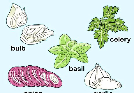 Prep your vegetables and herbs. Slice off the stalks to your fennel bulb and then chop the bulb. Then chop your celery, onion, basil, and parsley. Finally, mince your garlic.