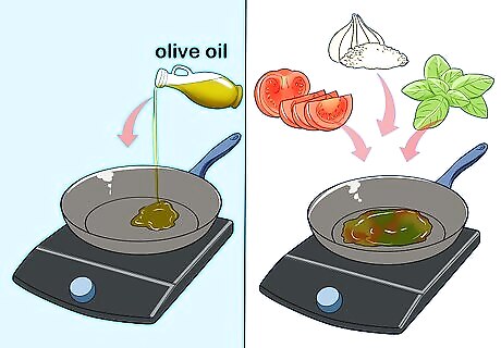 Saute your tomatoes and basil. Once you put the fennel in, use your olive oil to coat the bottom of a skillet. Turn the burner to medium heat. Once the oil heats up, add the tomatoes and basil, plus the last half of your garlic. Saute for about 2 minutes, then switch off the burner and move the skillet to a cool burner.