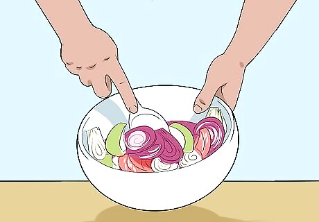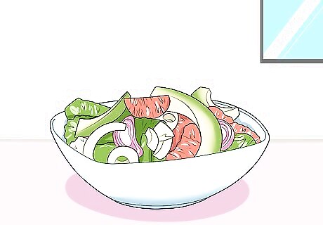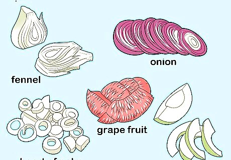 Prep your veggies. Cut off the fennel’s stalks and slice the bulb thinly. Peel and slice your grapefruit and red onion. Drain and slice your hearts of palm. Peel your avocado, remove the pit, and slice the flesh. Rinse your greens and dry in a salad spinner if needed. Raw bulbs have a crisp, watery texture that’s ideal for salads, so many salad recipes call for them specifically. However, you can also use the leftover stalks from other recipes instead.