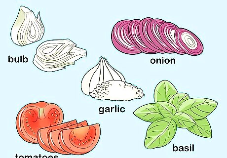 Prep your veggies and herb. Trim the stalks from your fennel bulbs and chop the bulbs up. Also chop up your tomatoes, onions, and basil. Then mince your garlic and shell your green peas.